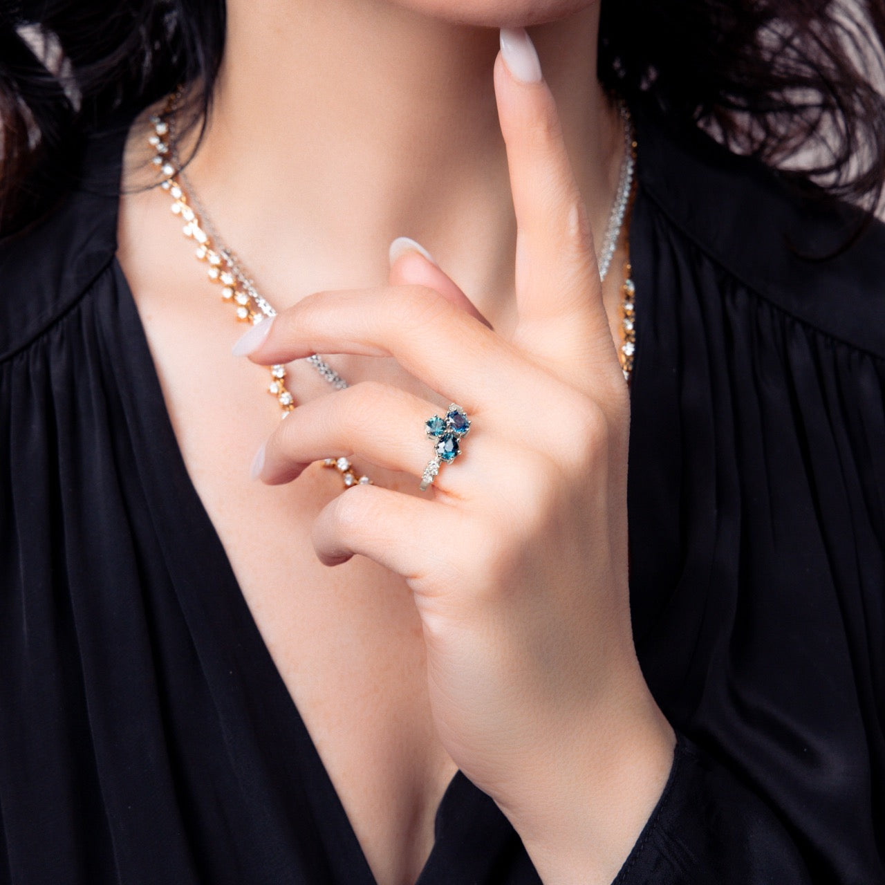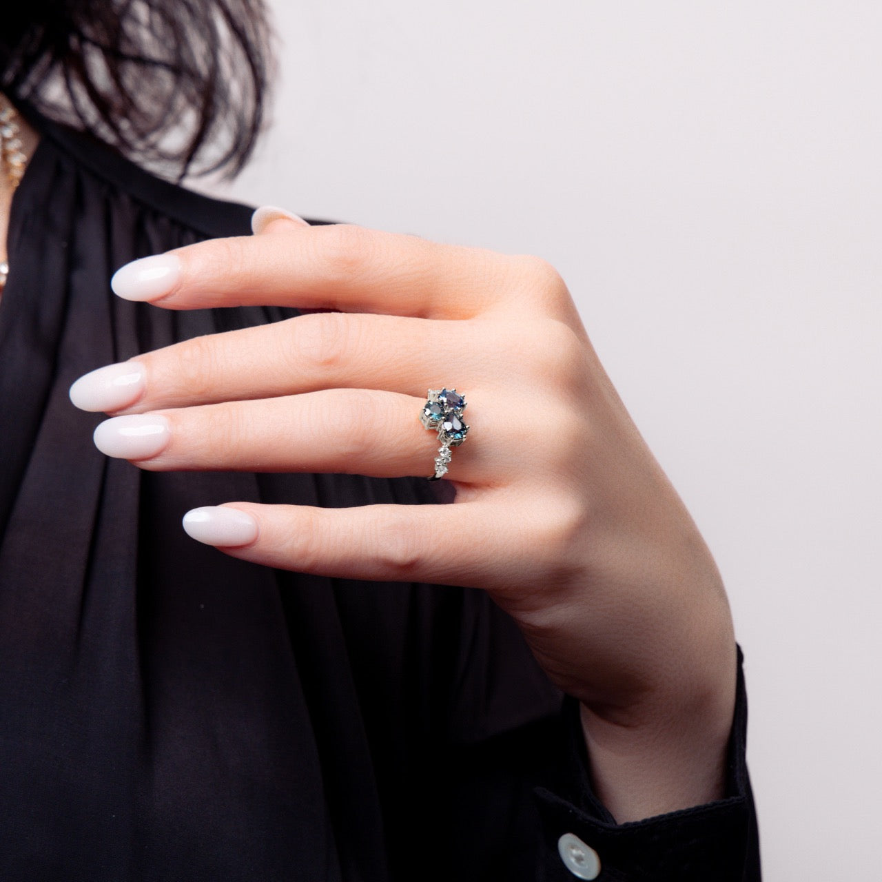 Inspirés de la nature, les pierres de taille diverses montés asymétriquement forment un bouquet et font de cette bague de fiançailles un bijou original pour une personne unique.