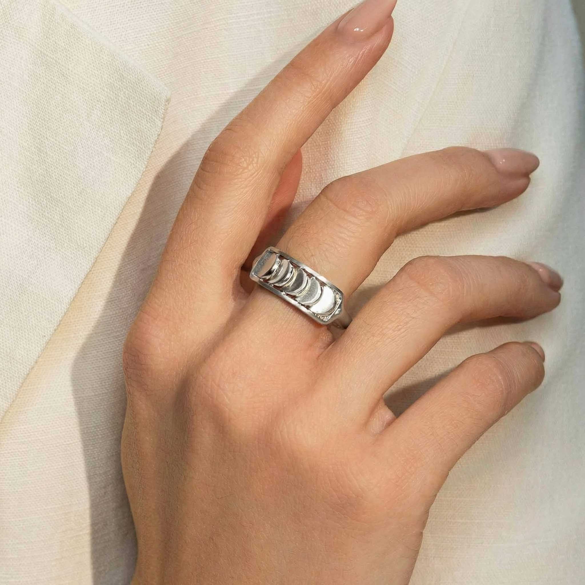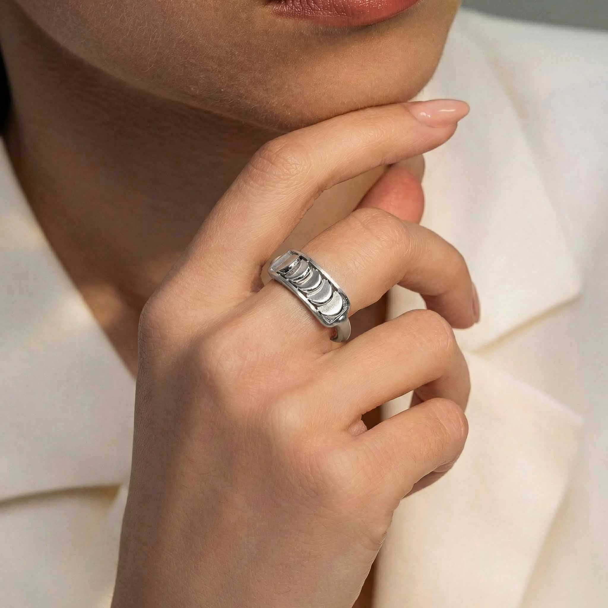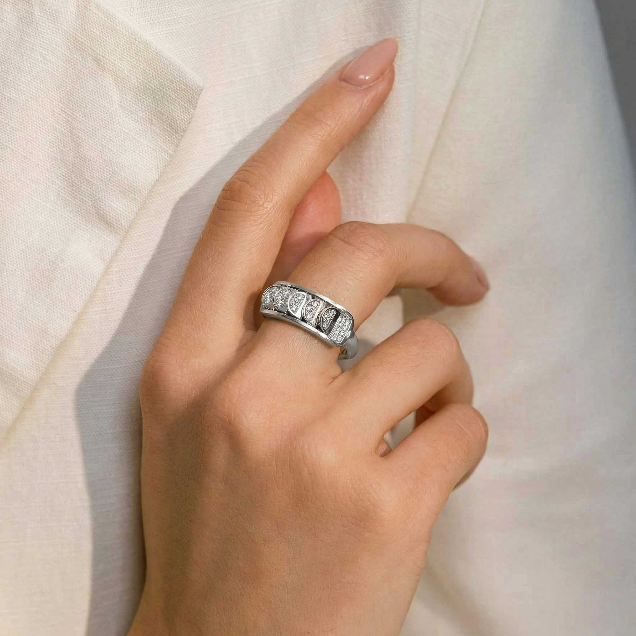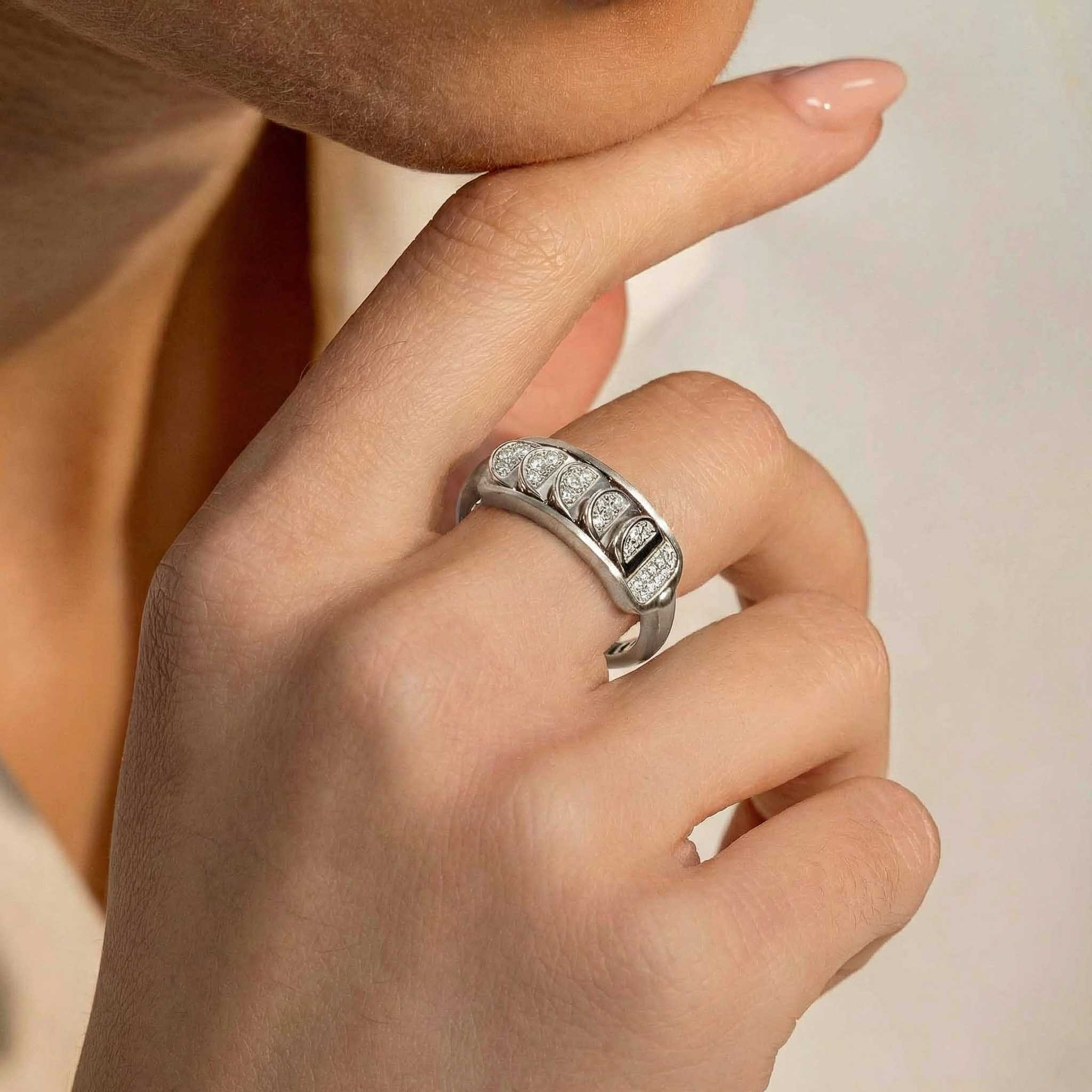 This Brushed White Gold Ring with Reversible Diamond Pavé Crescents shifts with you. The signature crescent motif flips seamlessly as the reversible mechanism reveals either diamond pavé brilliance or sculpted brushed white gold.