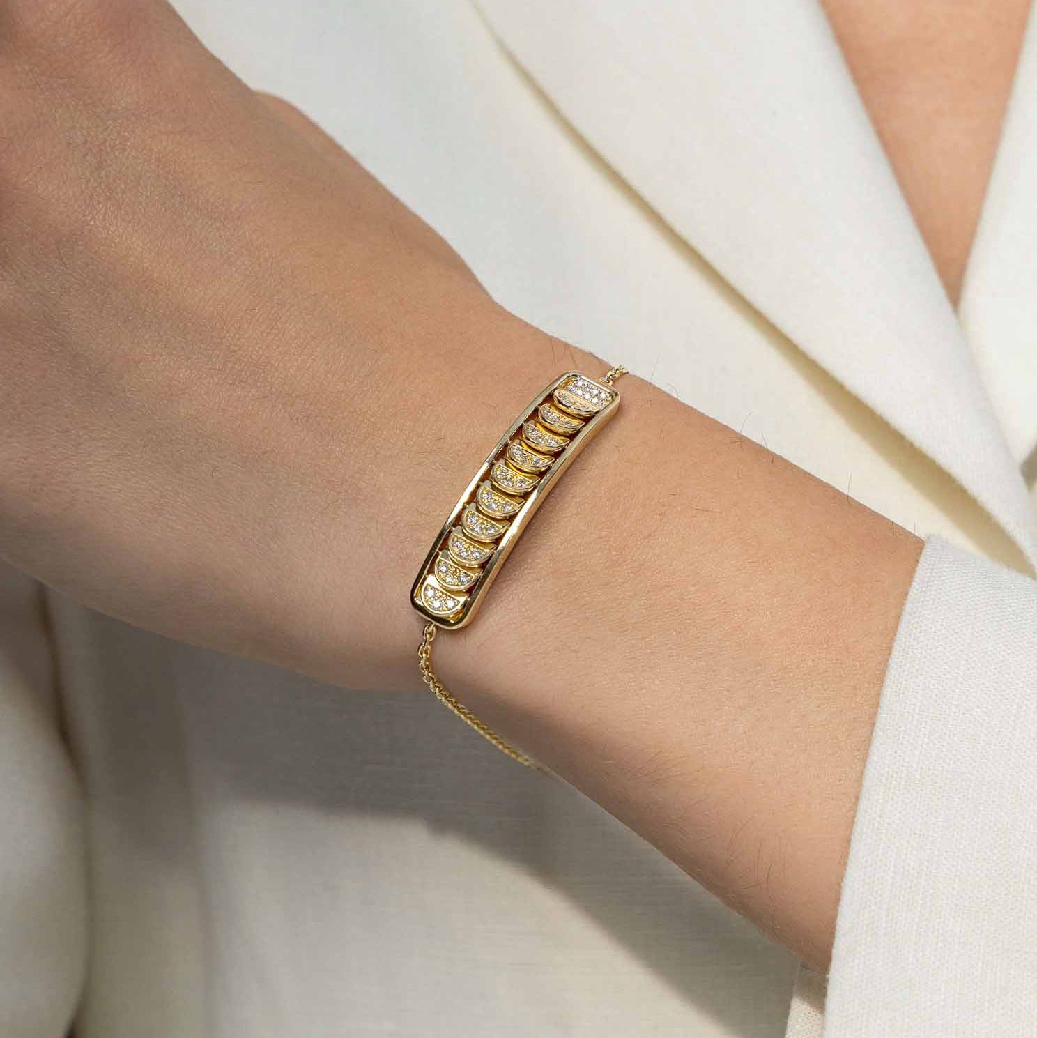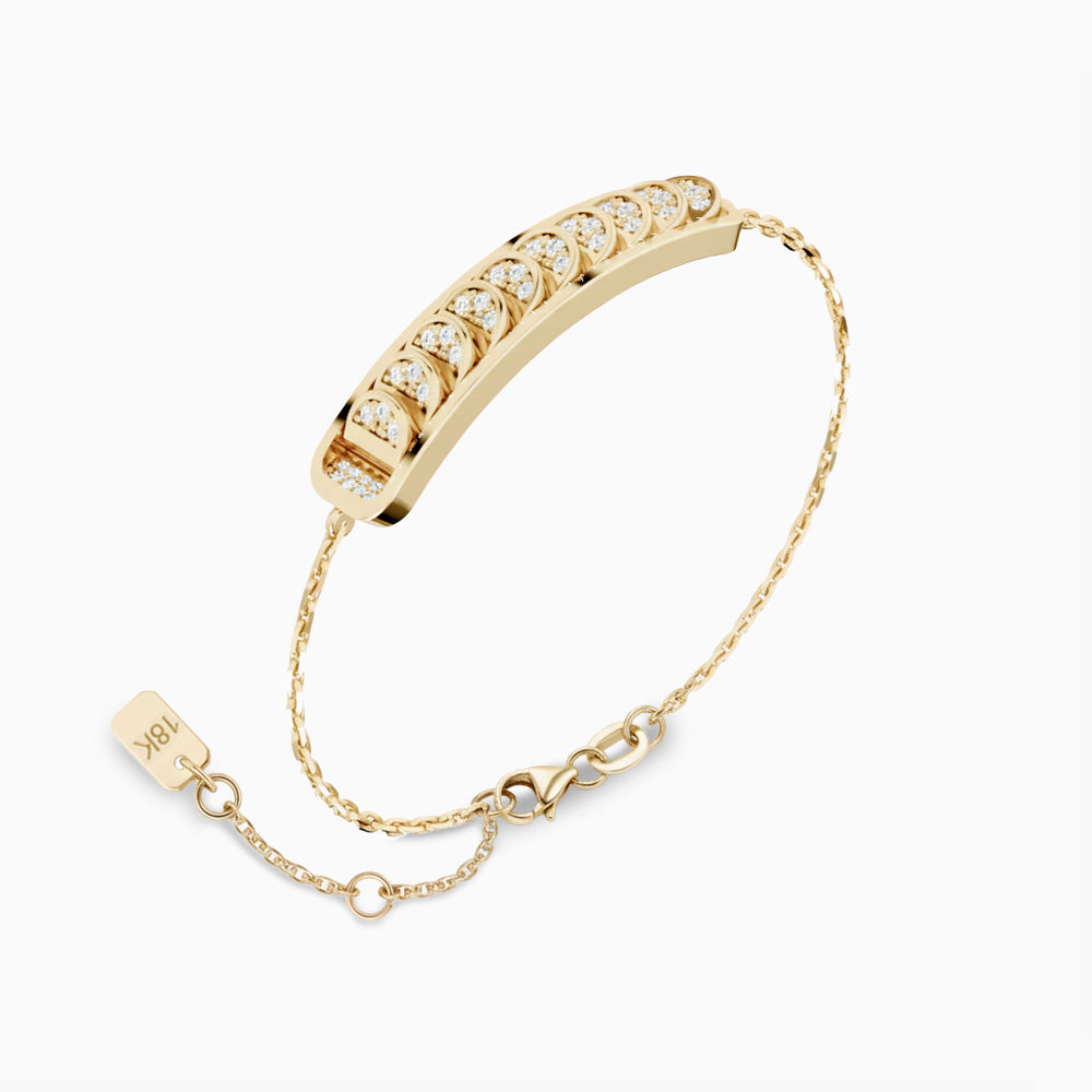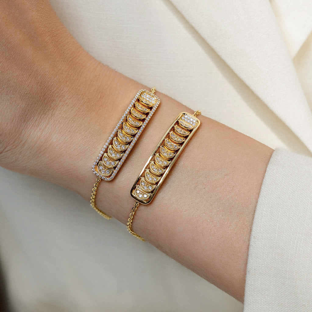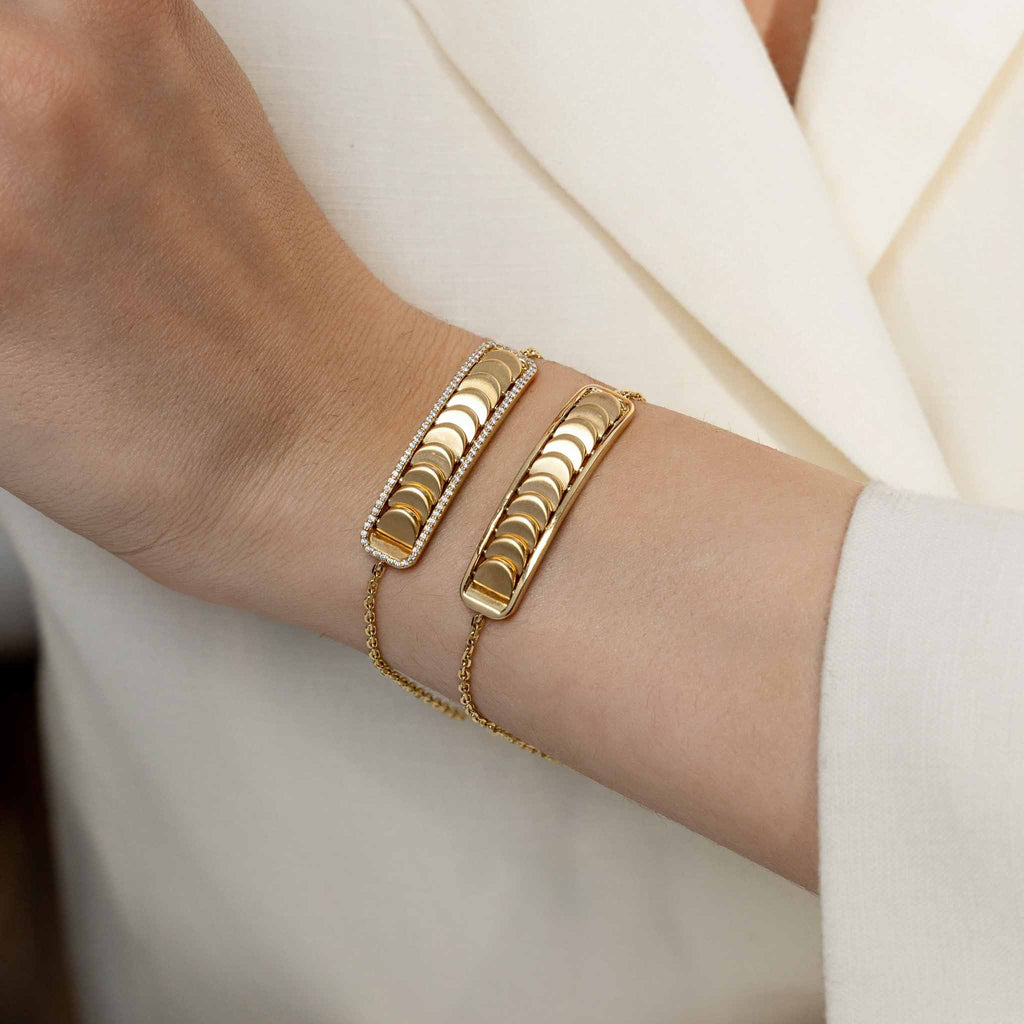 Ecksand's Aura is the embodiment of your own energy. It expands, intensifies, and transforms with you in an empowering ripple effect. This Chain Bracelet with Reversible Diamond Pavé Crescents shifts with you. The signature crescent motif flips seamlessly left to right as the reversible mechanism unveils either signature diamond pave or brushed gold crescents. Conceived by Creative Director Erica Bianchini and brought to life through the precision of Canadian craftsmanship, Aura reflects the Maison’s pursuit of form, innovation, and art of metamorphosis in fine jewelry.
