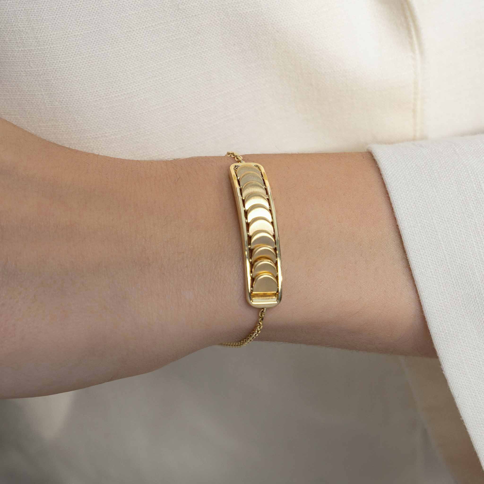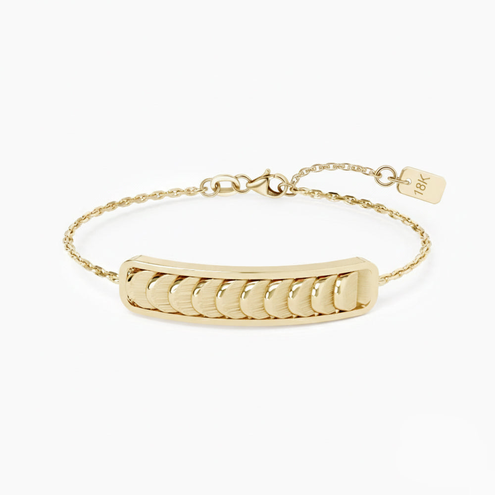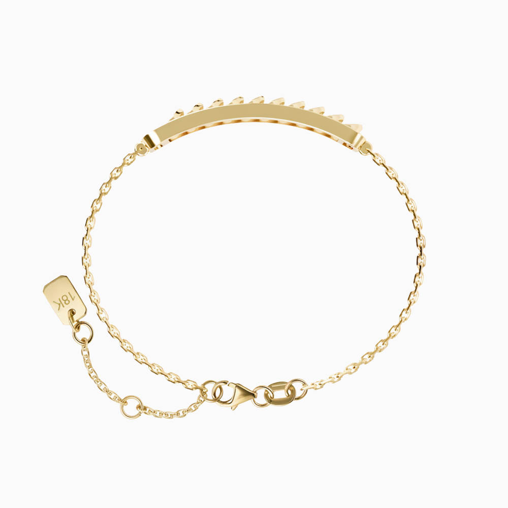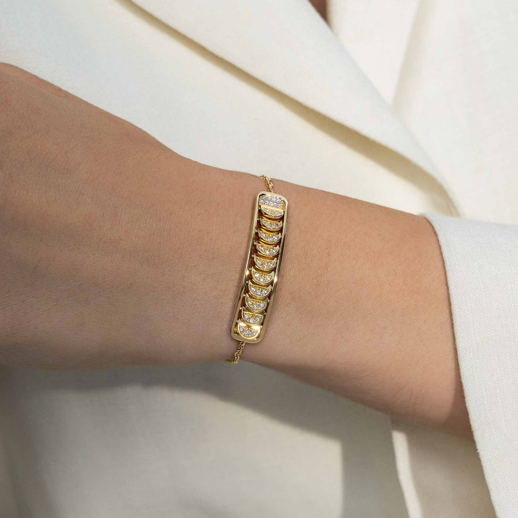 Ecksand's Aura is the embodiment of your own energy. It expands, intensifies, and transforms with you in an empowering ripple effect. This Chain Bracelet with Reversible Diamond Pavé Crescents shifts with you. The signature crescent motif flips seamlessly left to right as the reversible mechanism unveils either signature diamond pave or brushed gold crescents. Conceived by Creative Director Erica Bianchini and brought to life through the precision of Canadian craftsmanship, Aura reflects the Maison’s pursuit of form, innovation, and art of metamorphosis in fine jewelry.