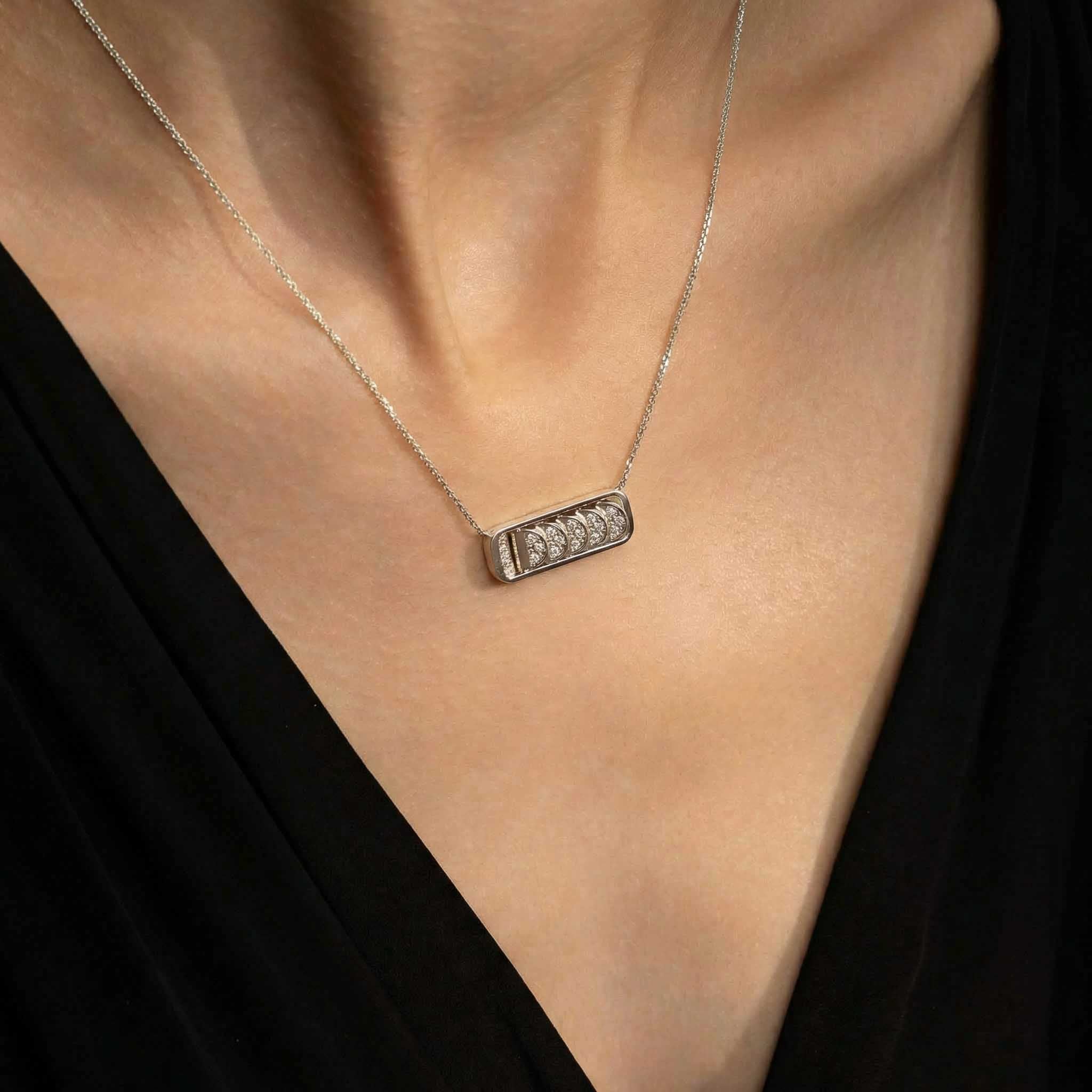 This White Gold Chain Necklace with Reversible Diamond Pavé Crescents shifts with you. The signature crescent motif flips seamlessly as the reversible mechanism reveals either diamond pavé brilliance or sculpted brushed white gold.