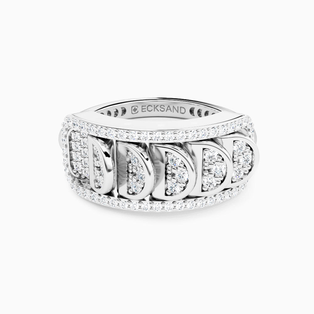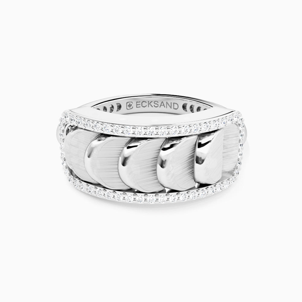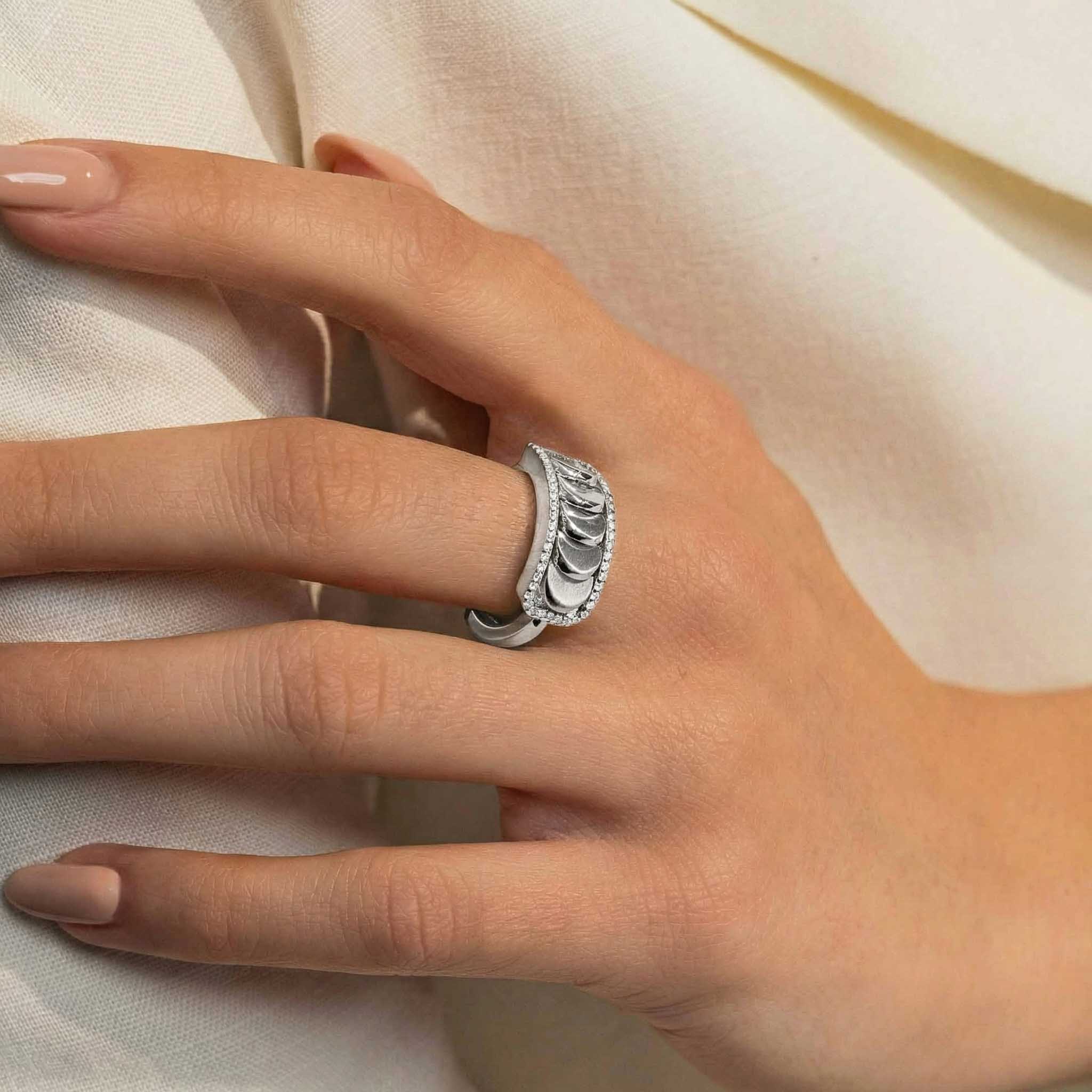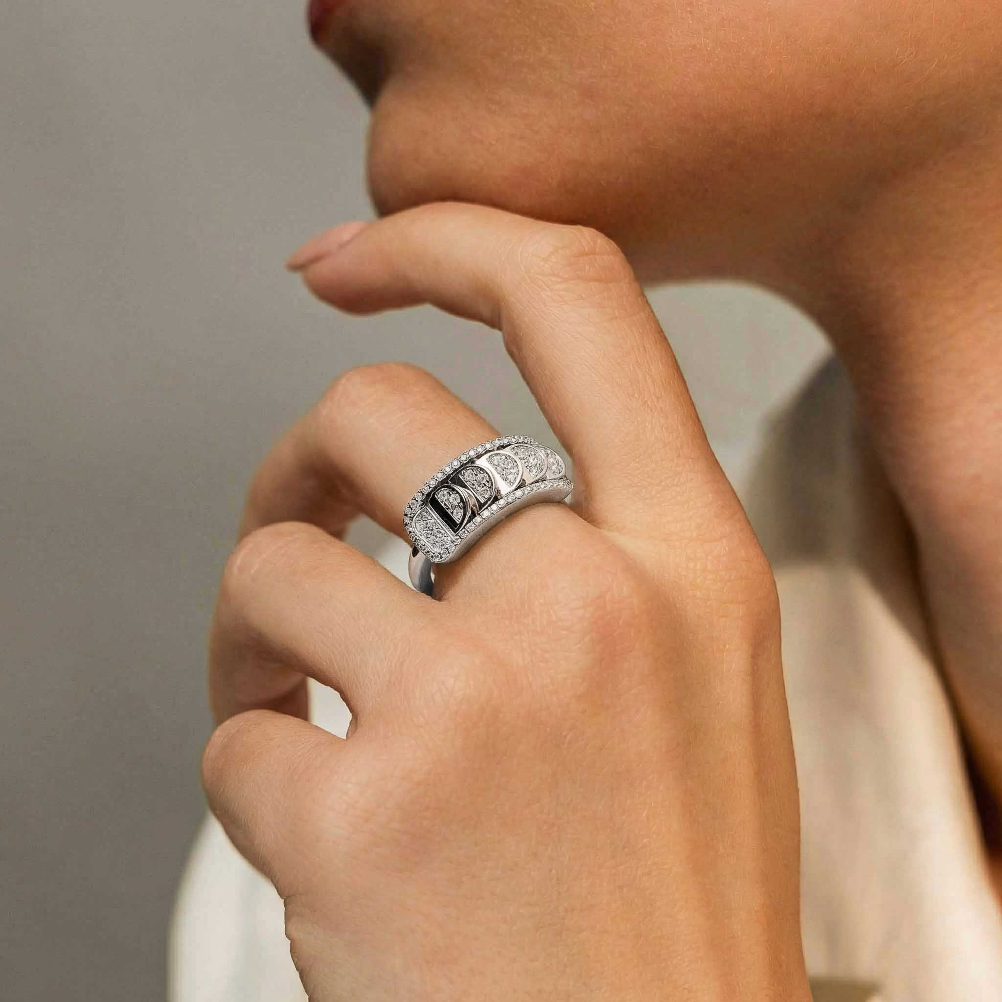 This White Gold Diamond Ring with Reversible Diamond Pavé Crescents shifts with you. The signature crescent motif flips seamlessly as the reversible mechanism reveals either diamond pavé brilliance or sculpted brushed white gold.