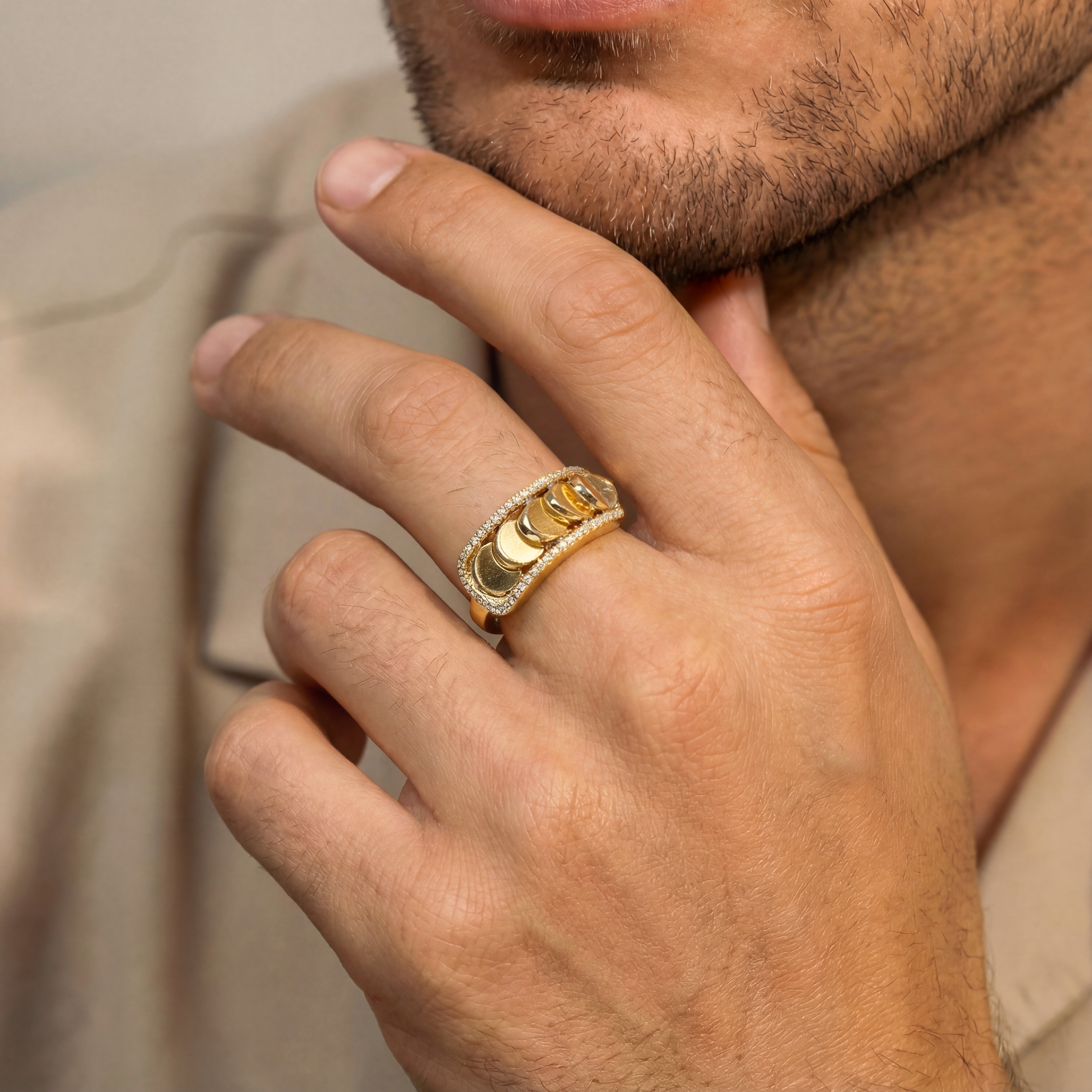 Ecksand's Aura is the embodiment of your own energy. It expands, intensifies, and transforms with you in an empowering ripple effect. This Gold Ring with Diamond Ring with Reversible Diamond Pavé Crescents shifts with you. The signature crescent motif flips seamlessly as the reversible mechanism unveils either signature diamond pave or brushed gold crescents. Conceived by Creative Director Erica Bianchini and brought to life through the precision of Canadian craftsmanship, Aura reflects the Maison’s pursuit of form, innovation, and art of metamorphosis in fine jewelry.