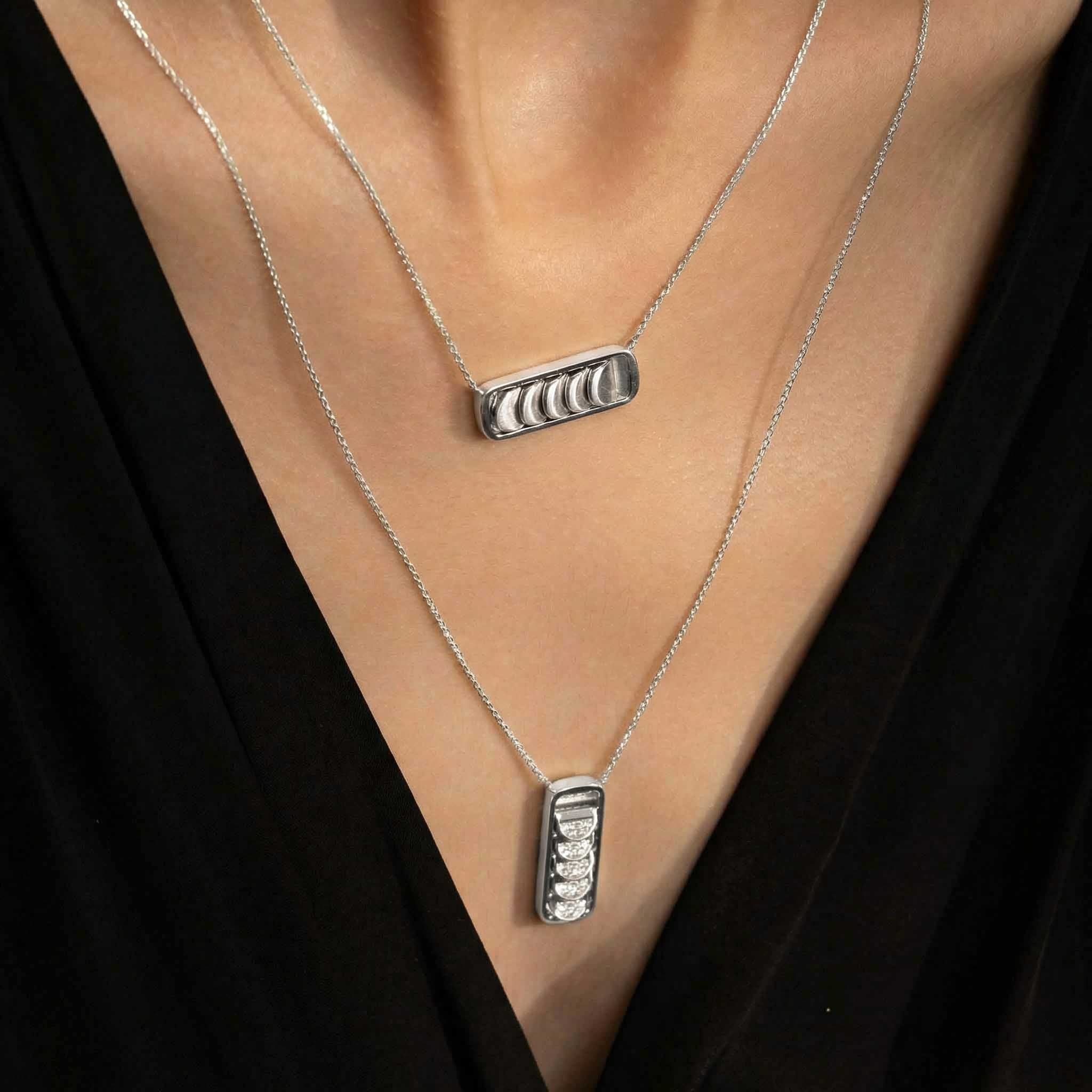 This White Gold Pendant Necklace with Reversible Diamond Pavé Crescents shifts with you. The signature crescent motif flips seamlessly as the reversible mechanism reveals either diamond pavé brilliance or sculpted brushed white gold.
