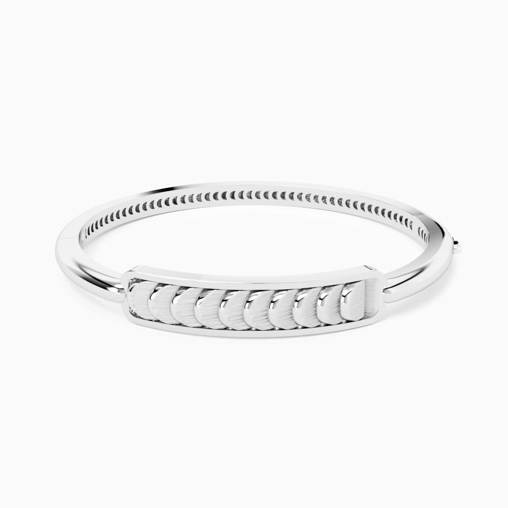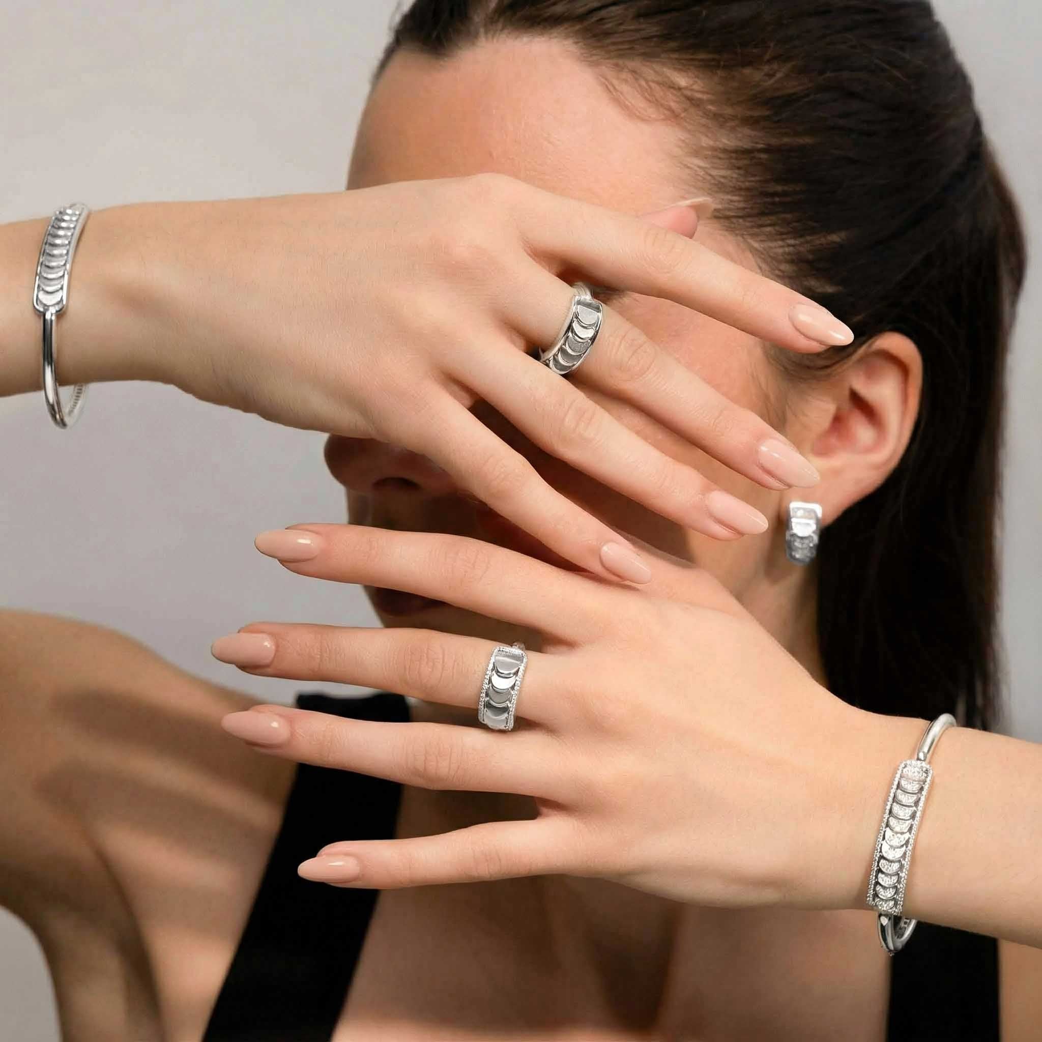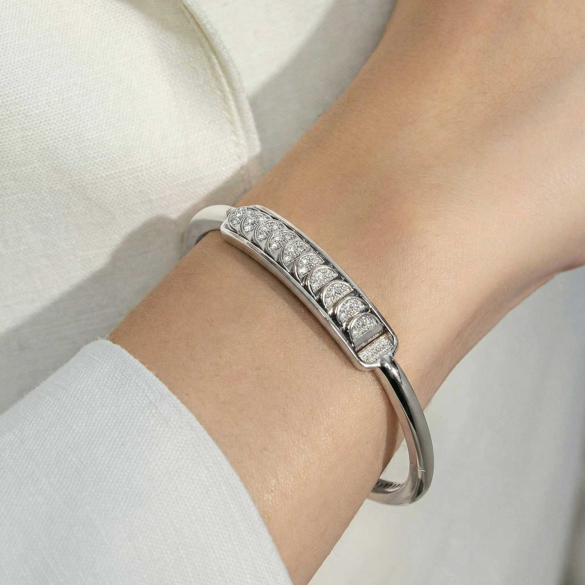 This White Gold Bangle with Reversible Diamond Pavé Crescents shifts with you. The signature crescent motif flips seamlessly as the reversible mechanism reveals either diamond pavé brilliance or sculpted brushed white gold.