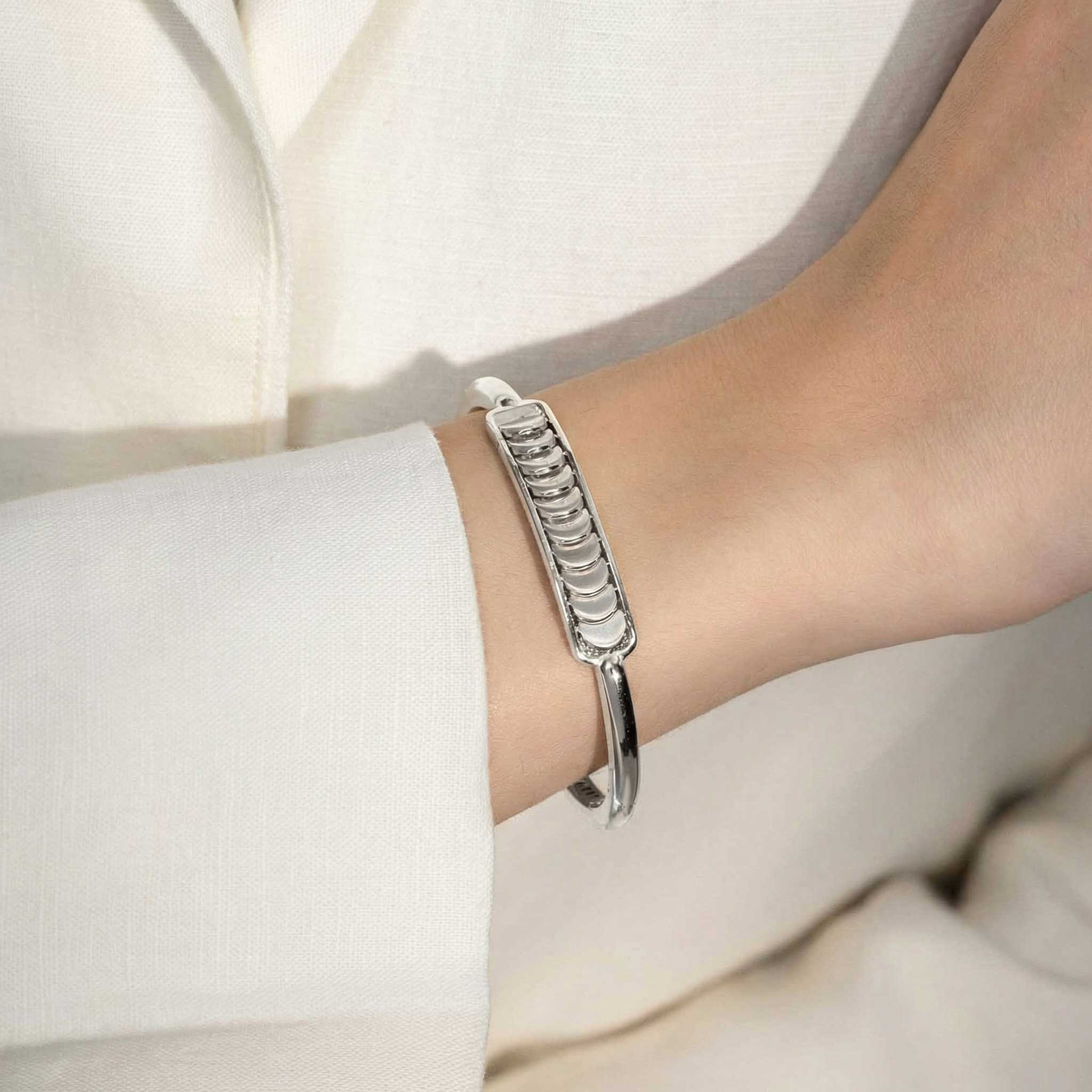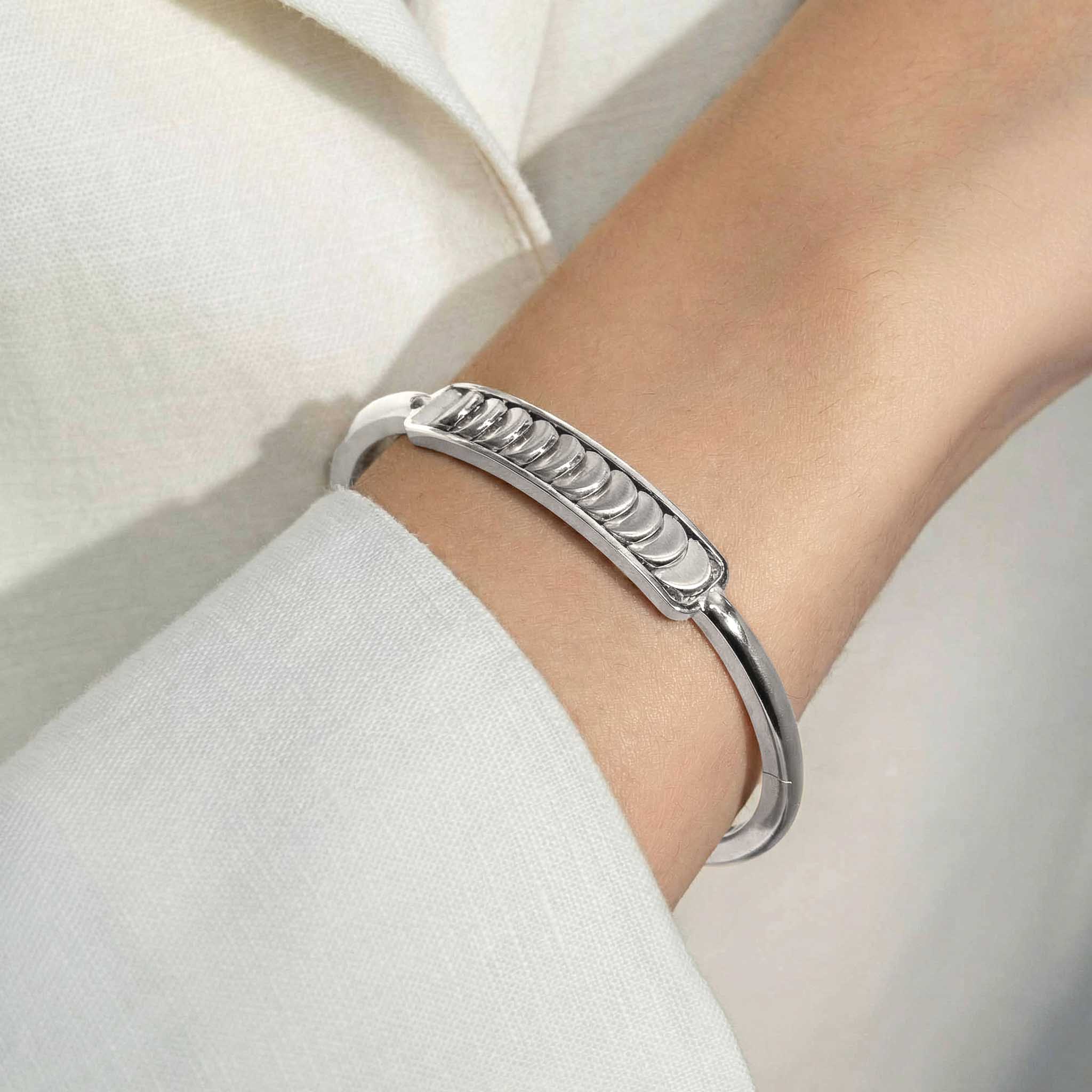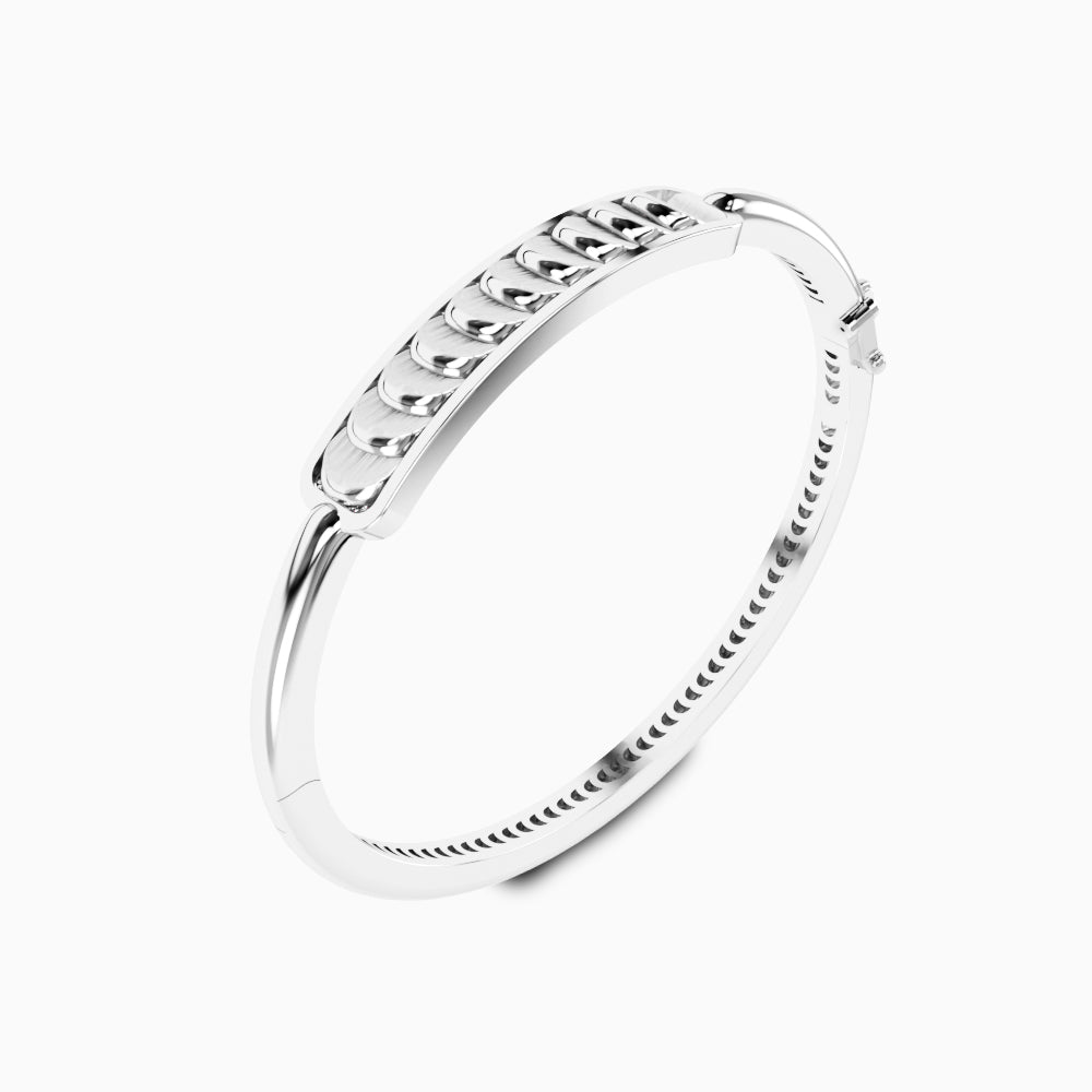 This White Gold Bangle with Reversible Diamond Pavé Crescents shifts with you. The signature crescent motif flips seamlessly as the reversible mechanism reveals either diamond pavé brilliance or sculpted brushed white gold.
