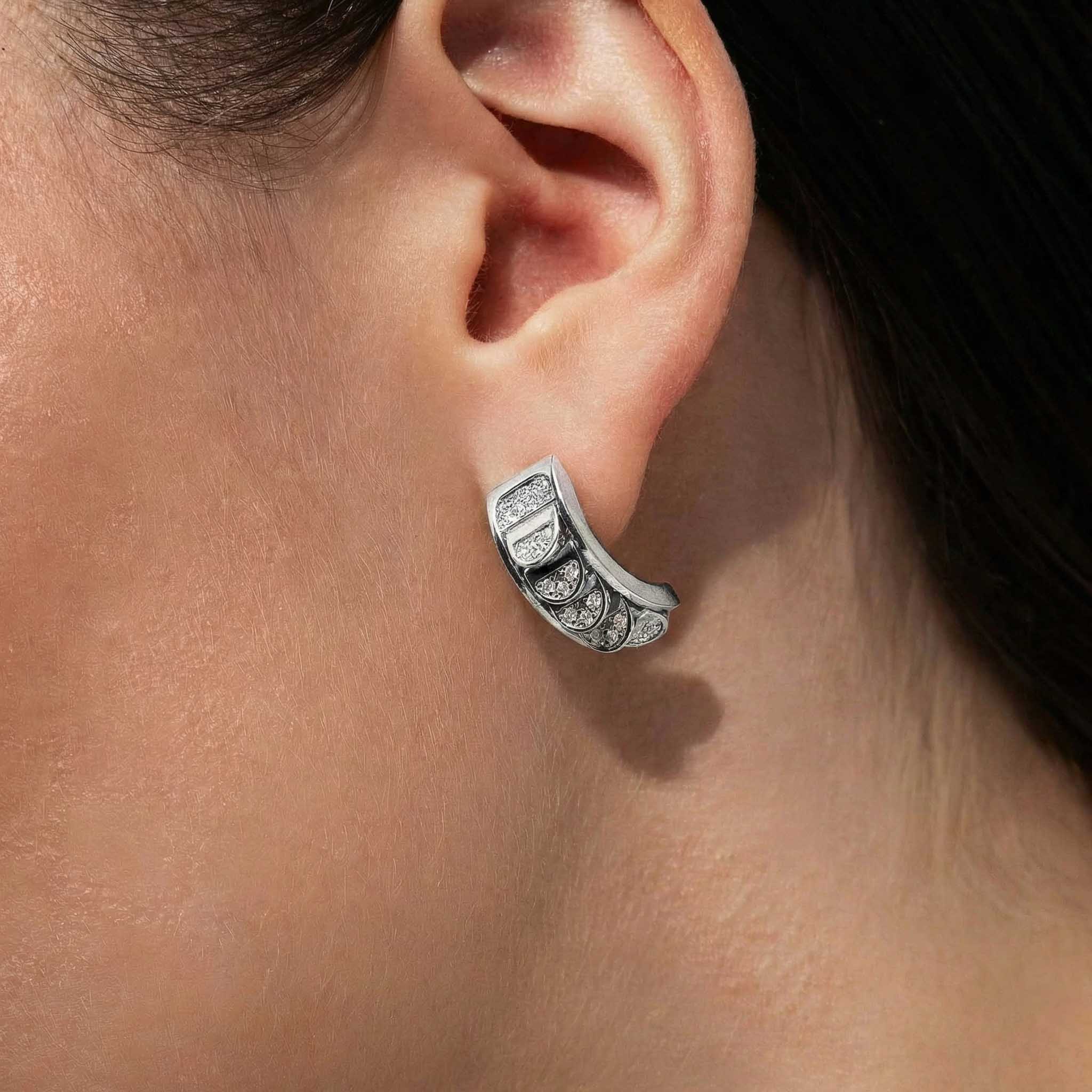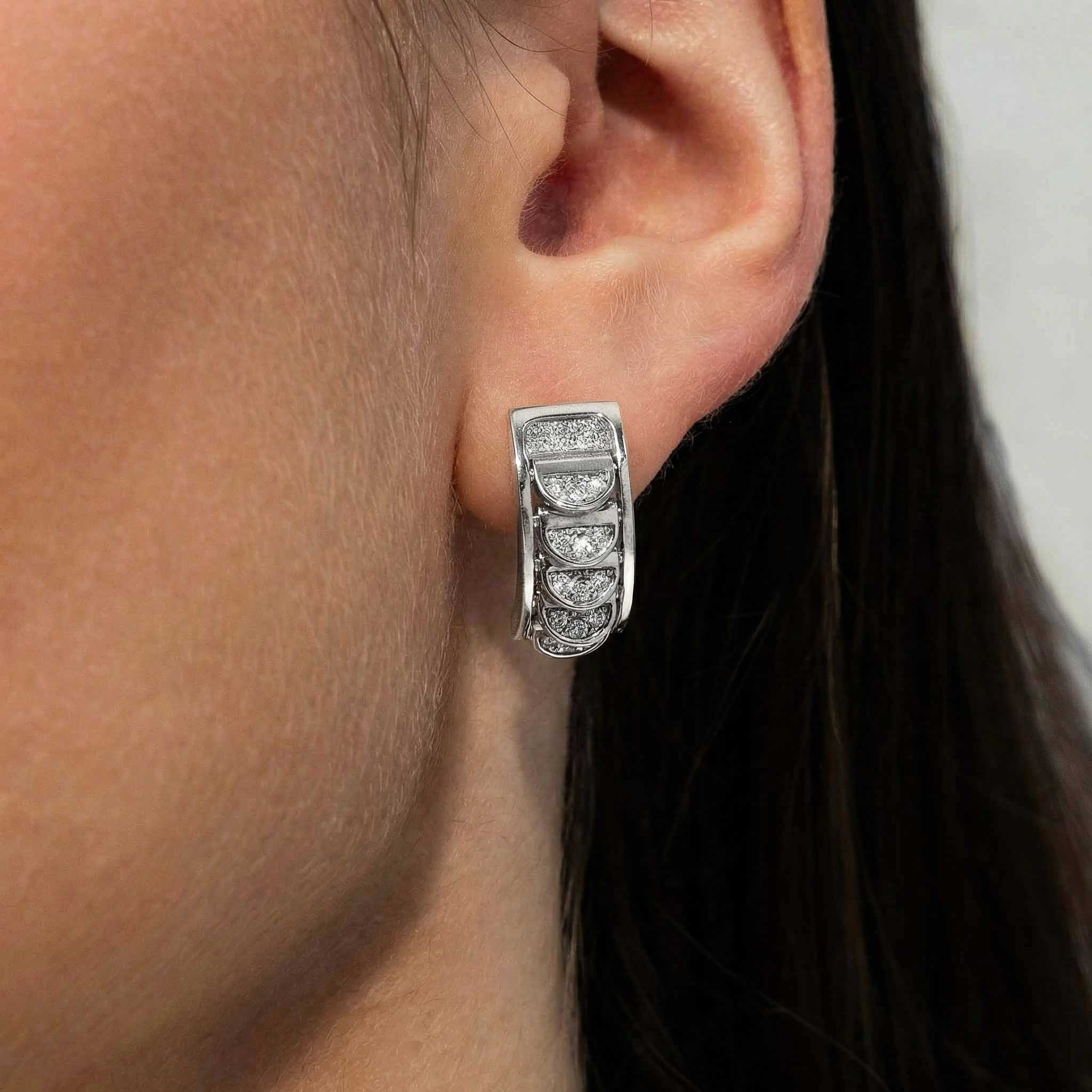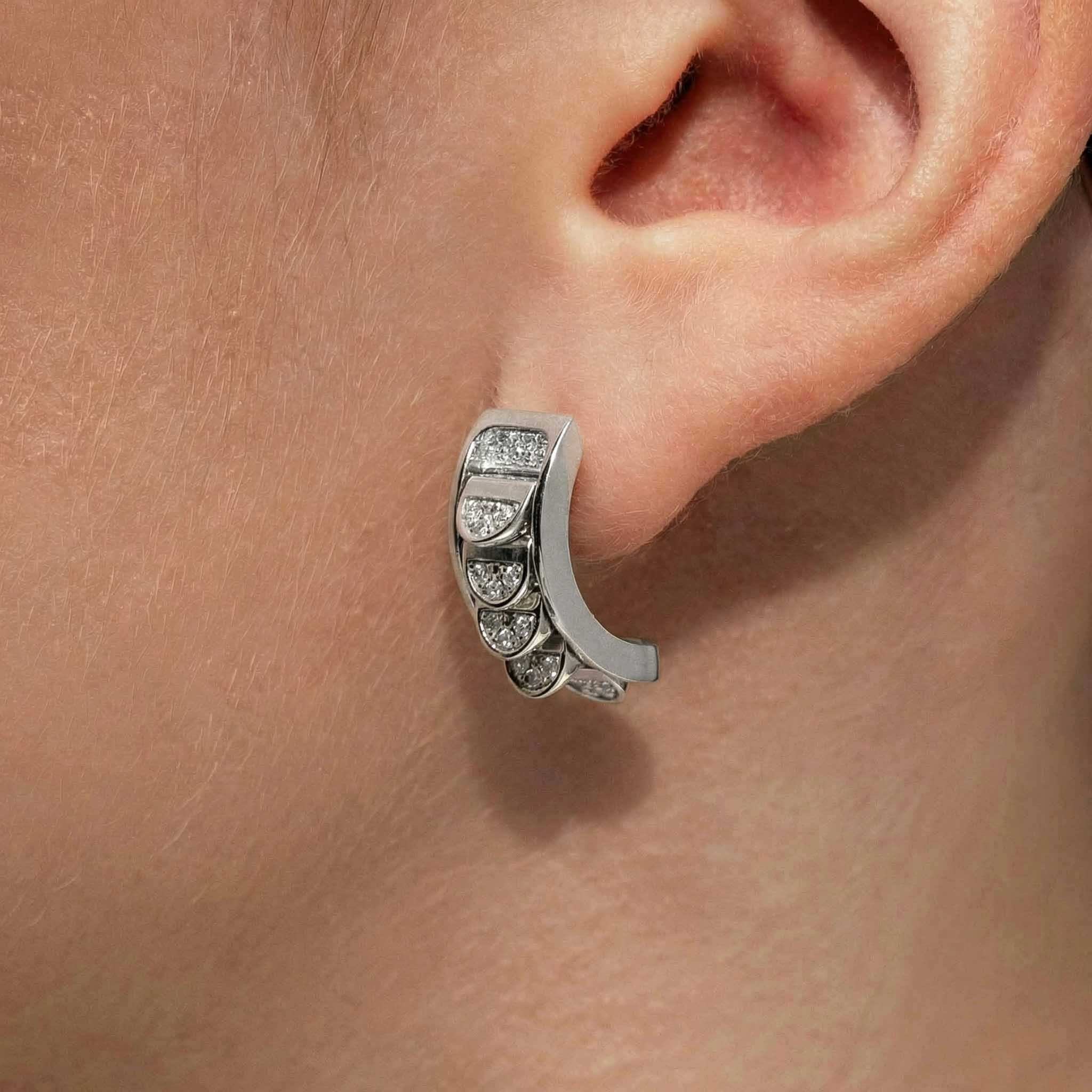 These White Gold Hoops with Reversible Diamond Pavé Crescents shifts with you. The signature crescent motif flips seamlessly as the reversible mechanism reveals either diamond pavé brilliance or sculpted brushed white gold.