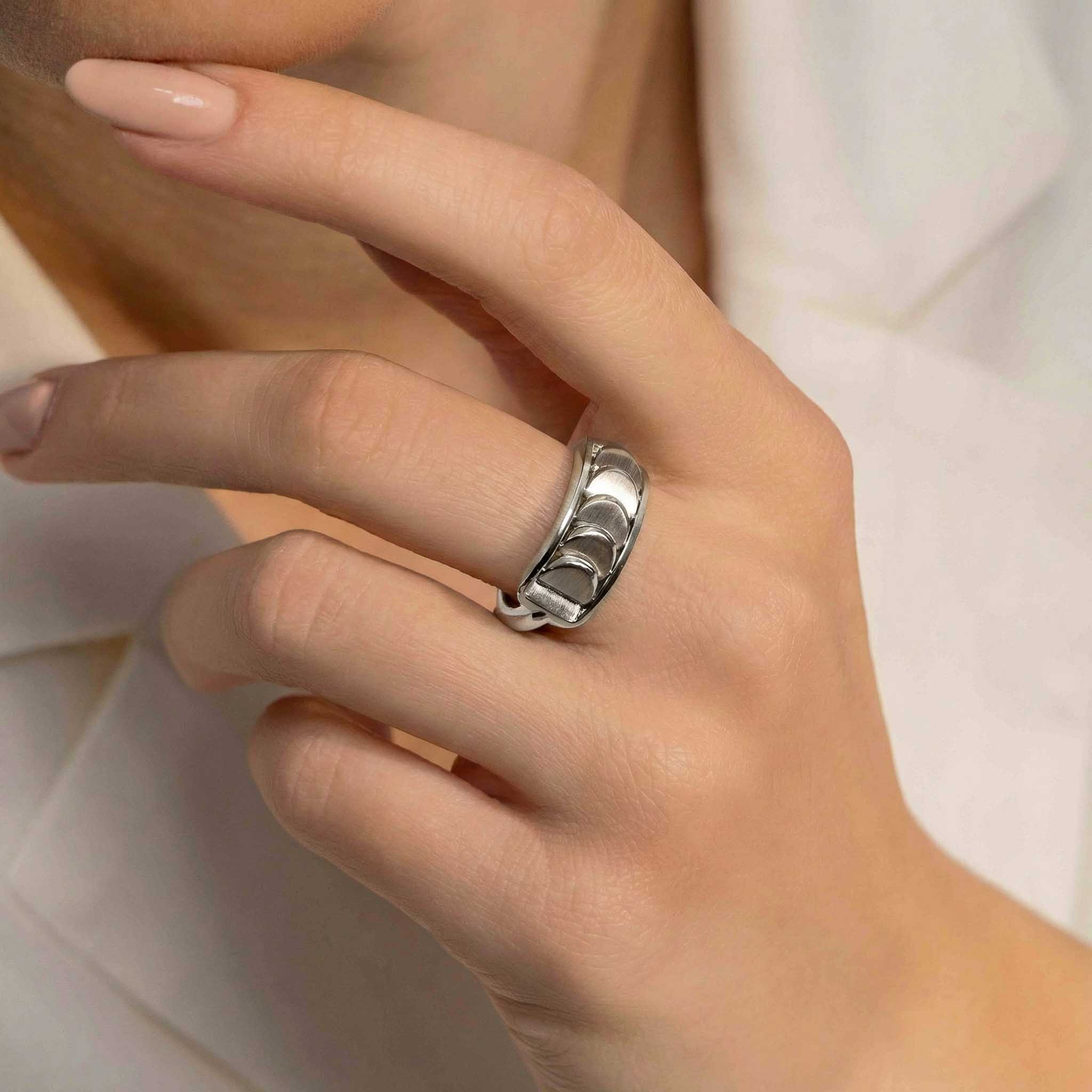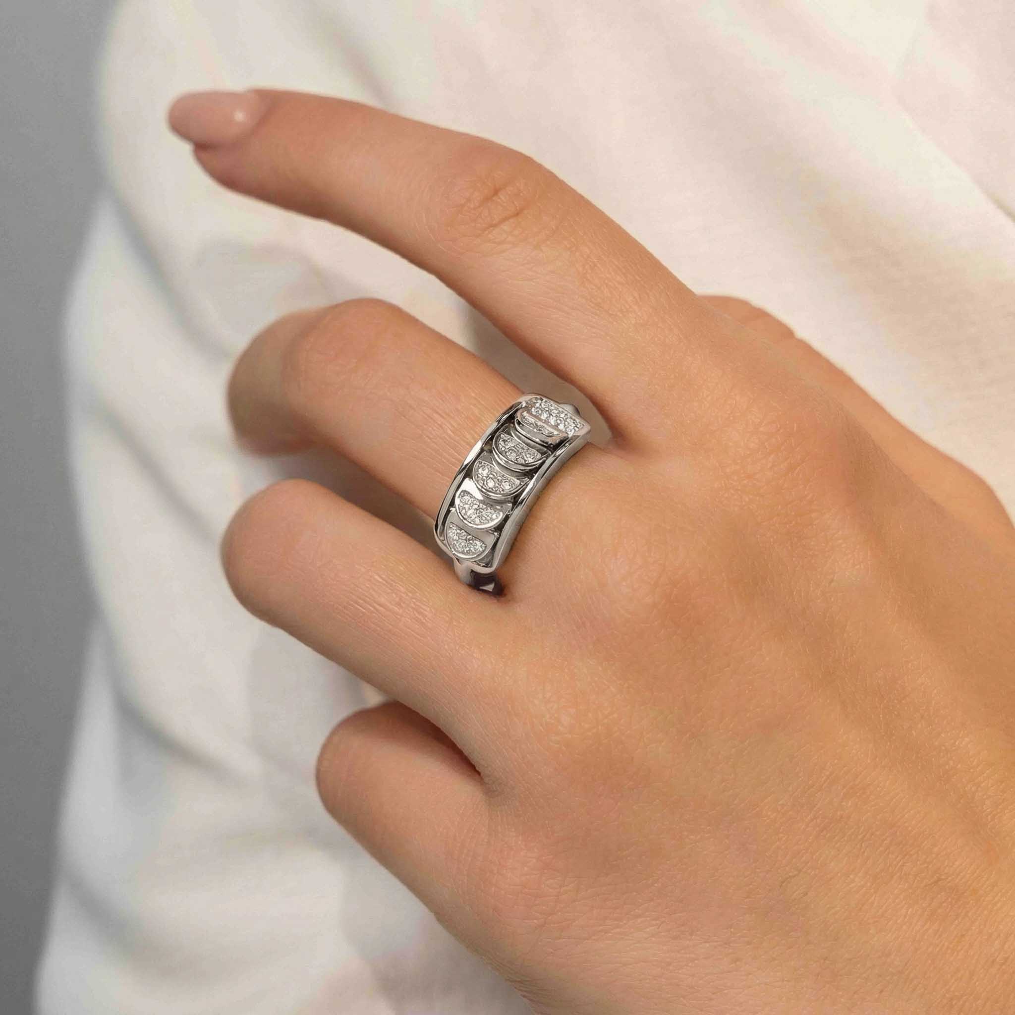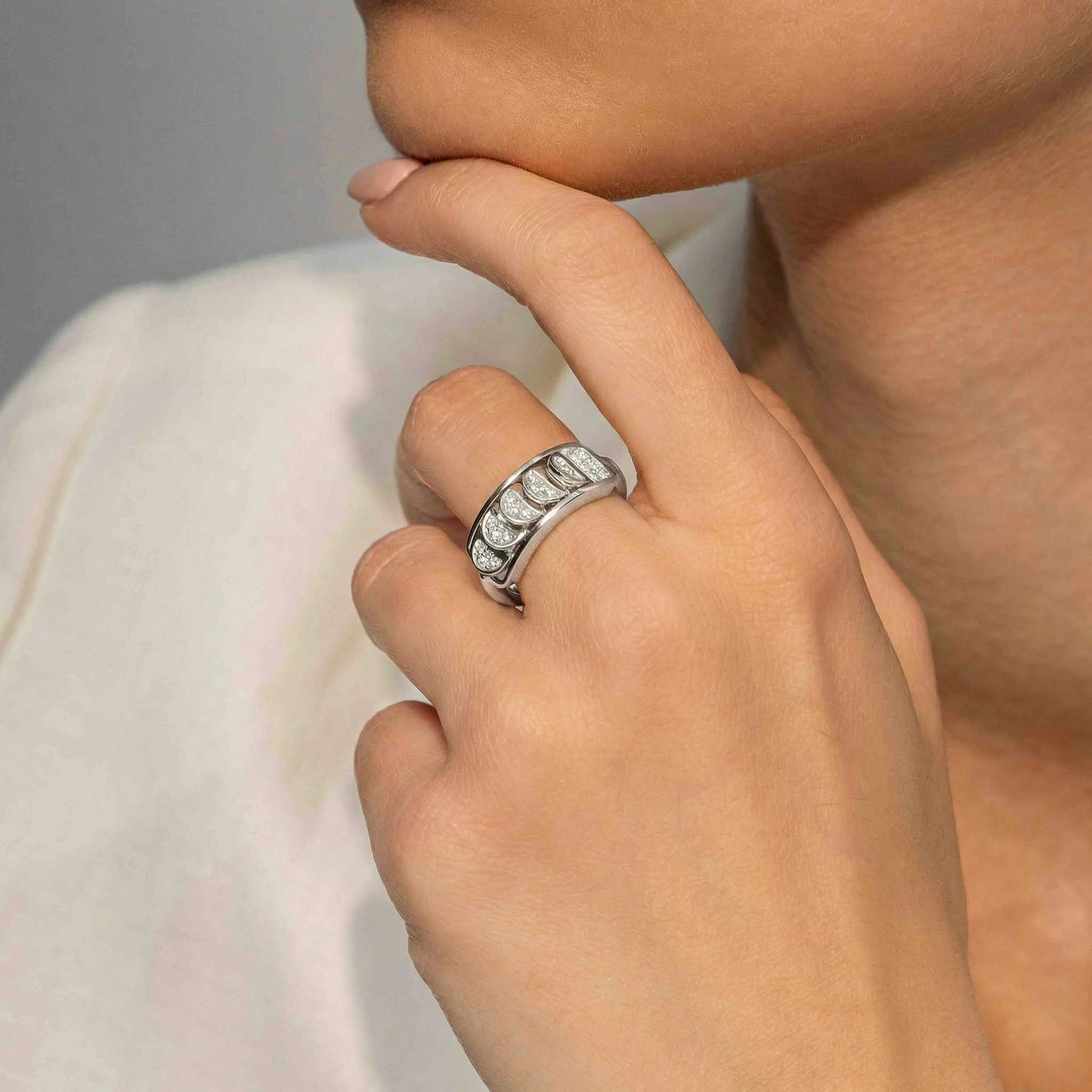This White Gold Ring with Reversible Diamond Pavé Crescents shifts with you. The signature crescent motif flips seamlessly as the reversible mechanism reveals either diamond pavé brilliance or sculpted brushed white gold.